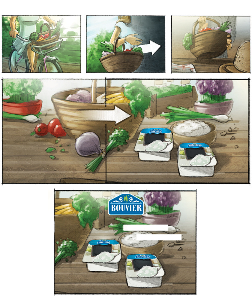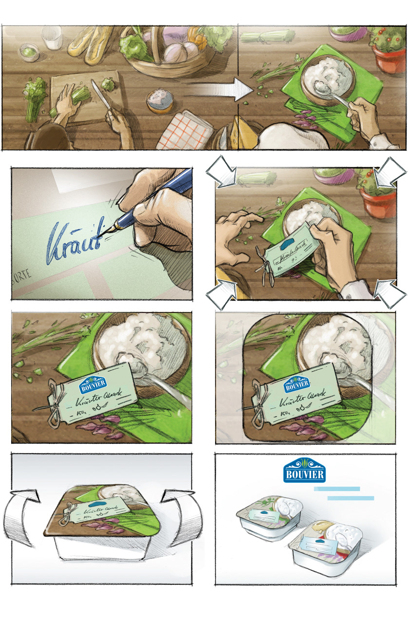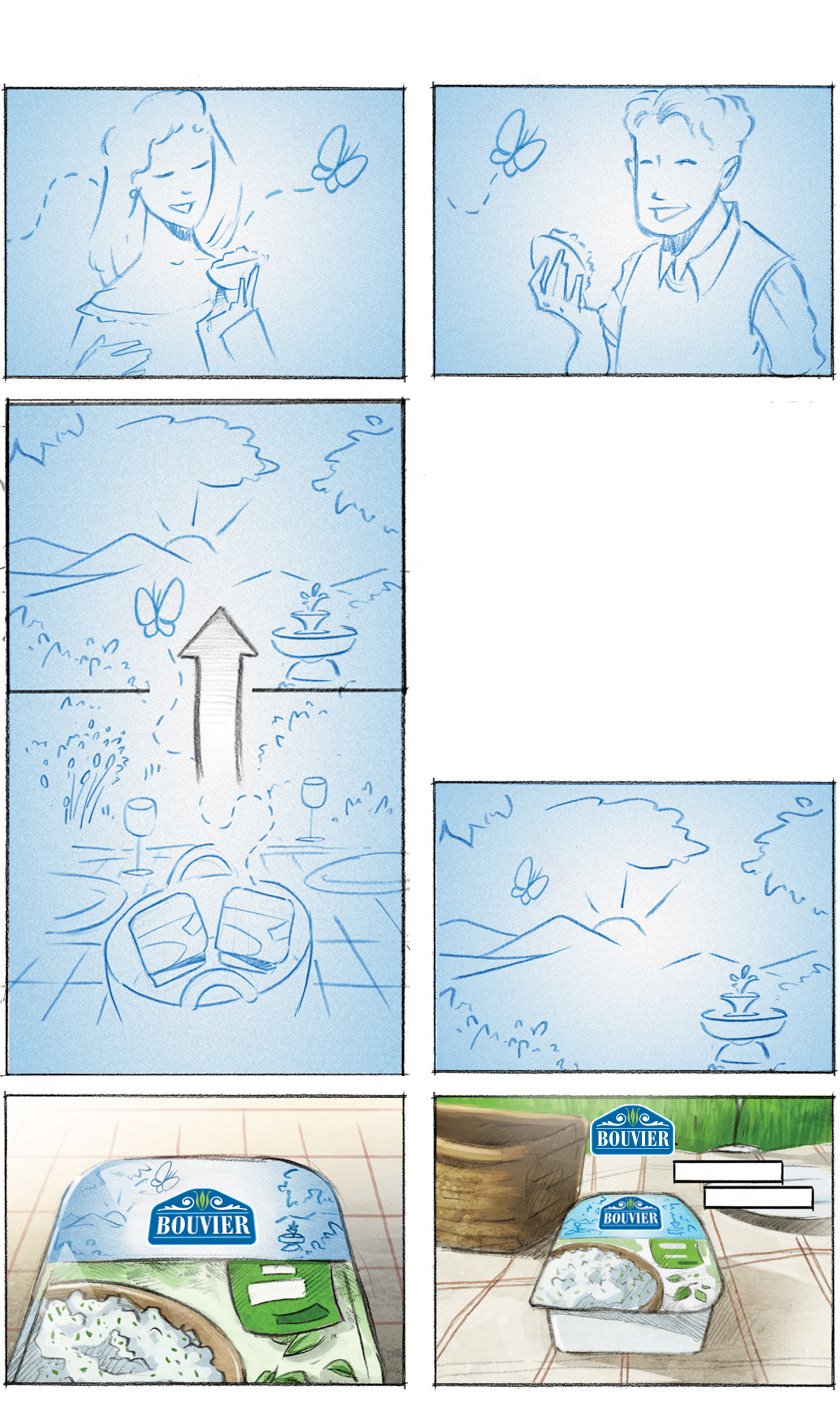 I was asked to do storyboards and come up with various concepts for commercial endings leading to a pack shot for a delicious creme cheese brand...